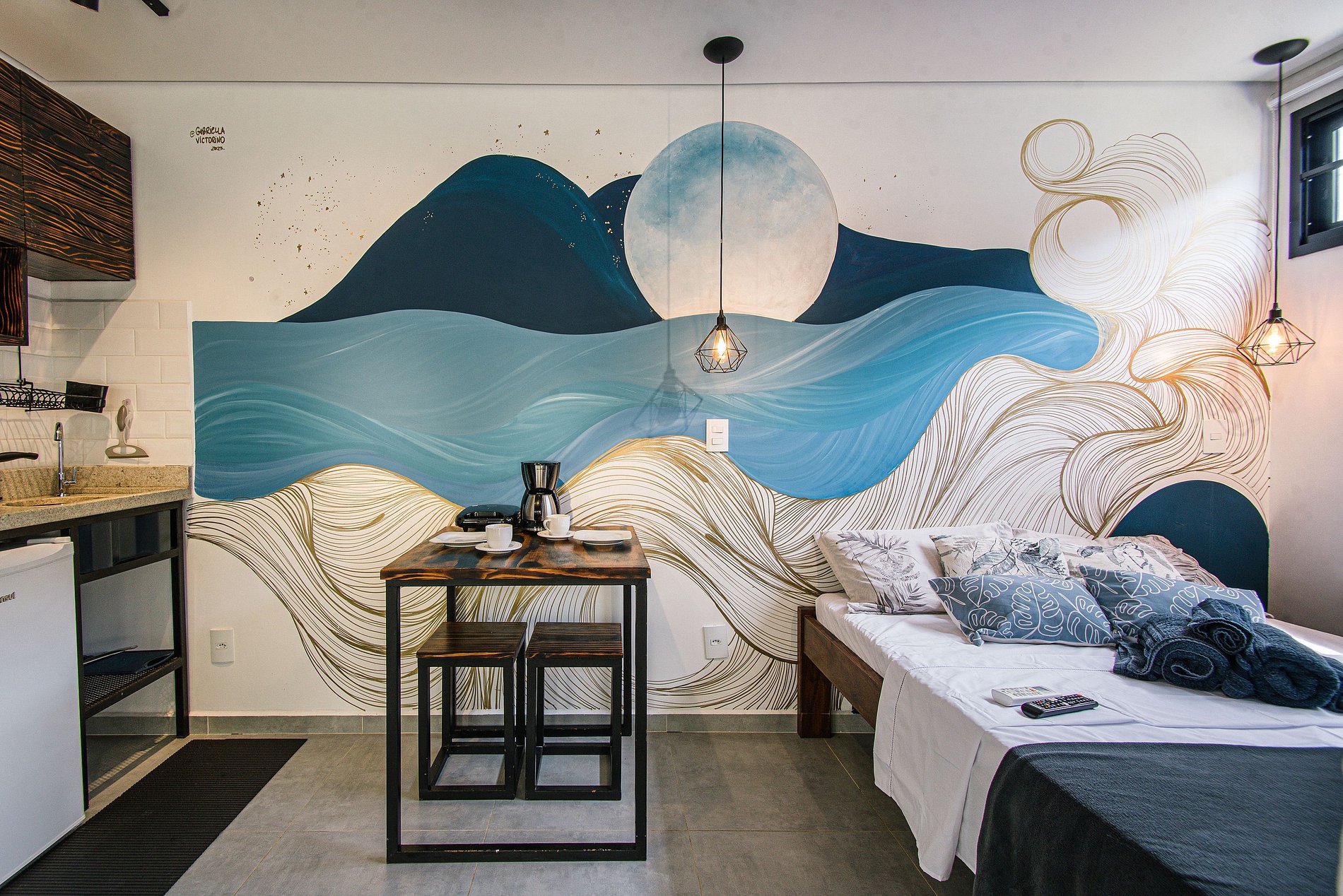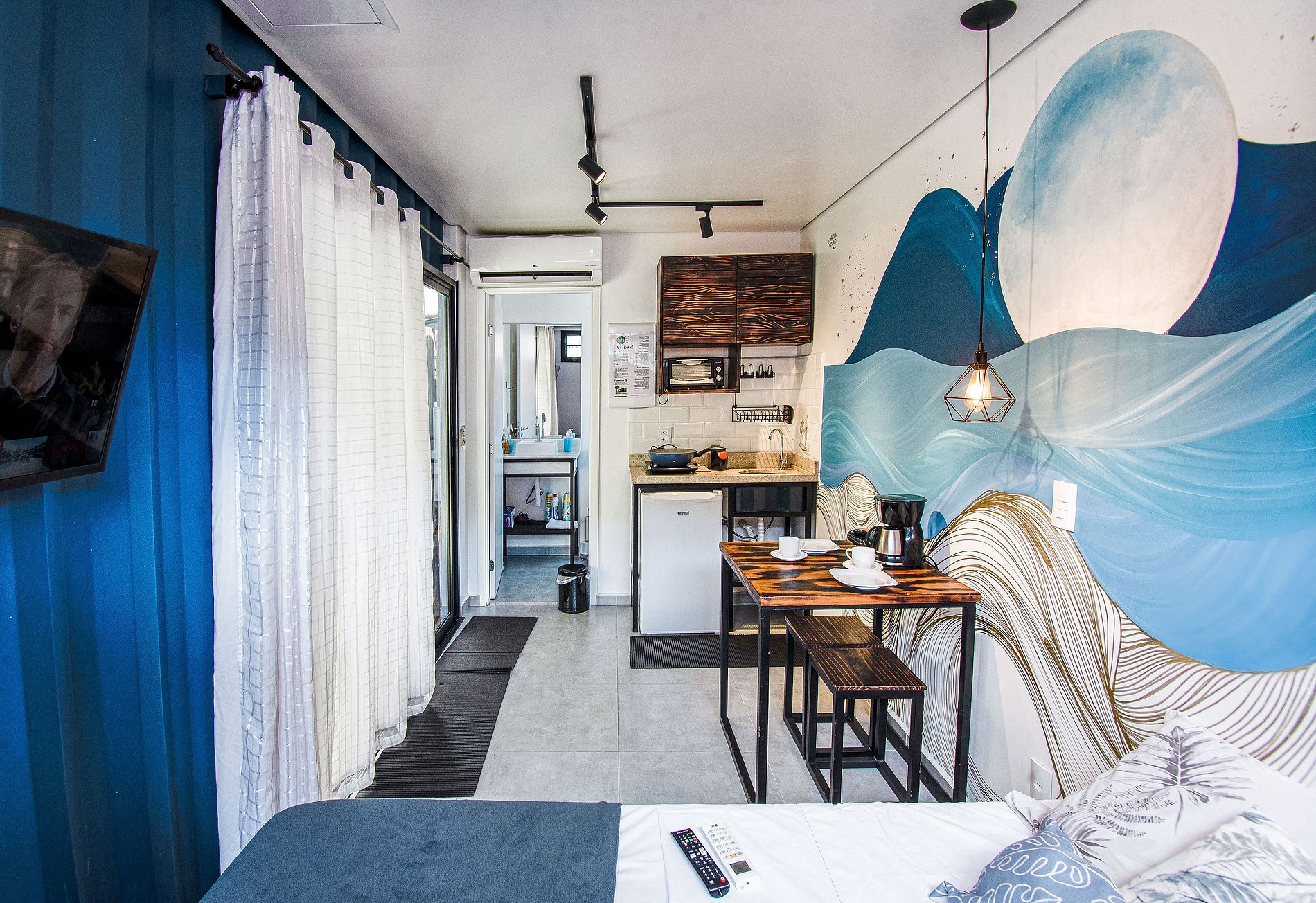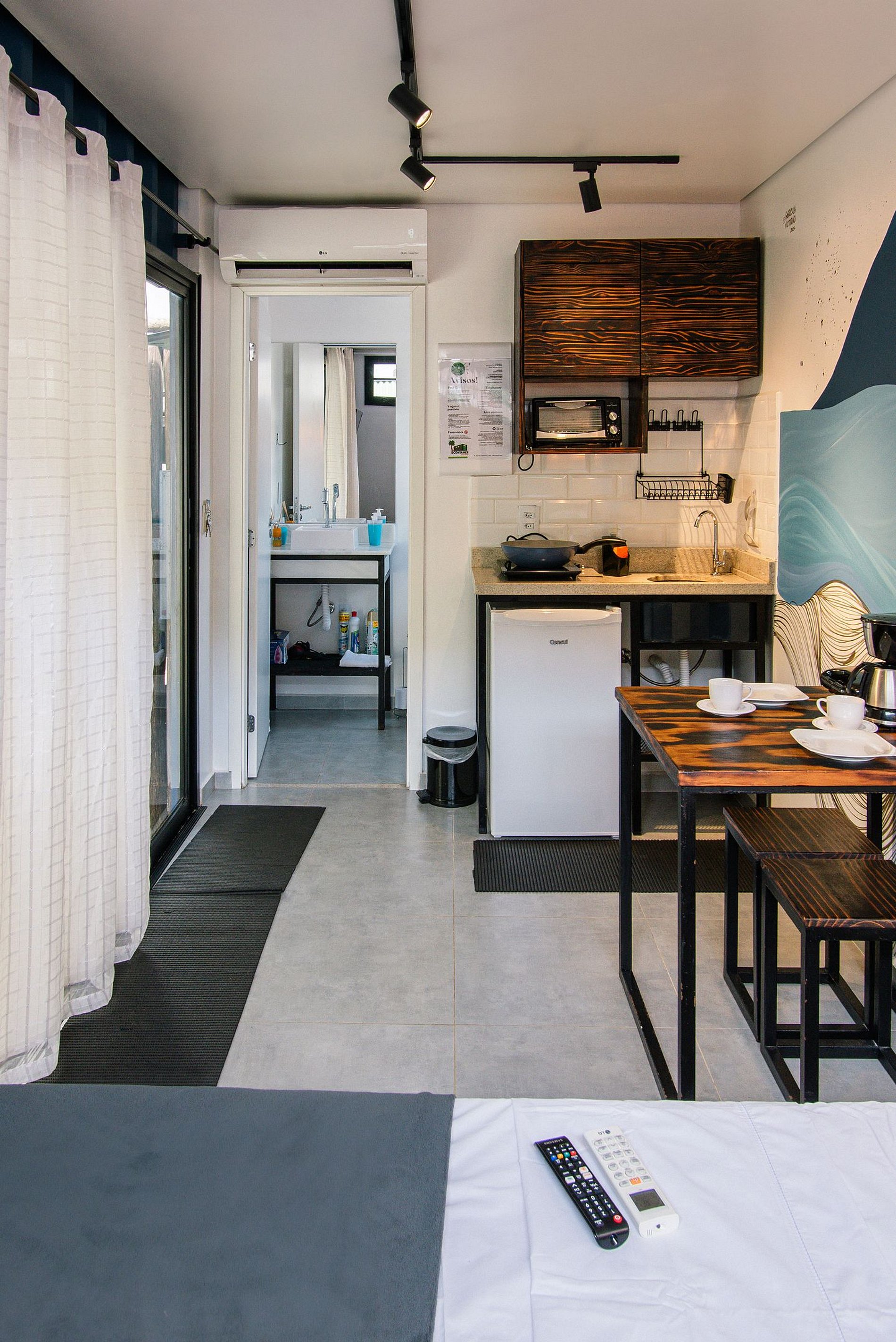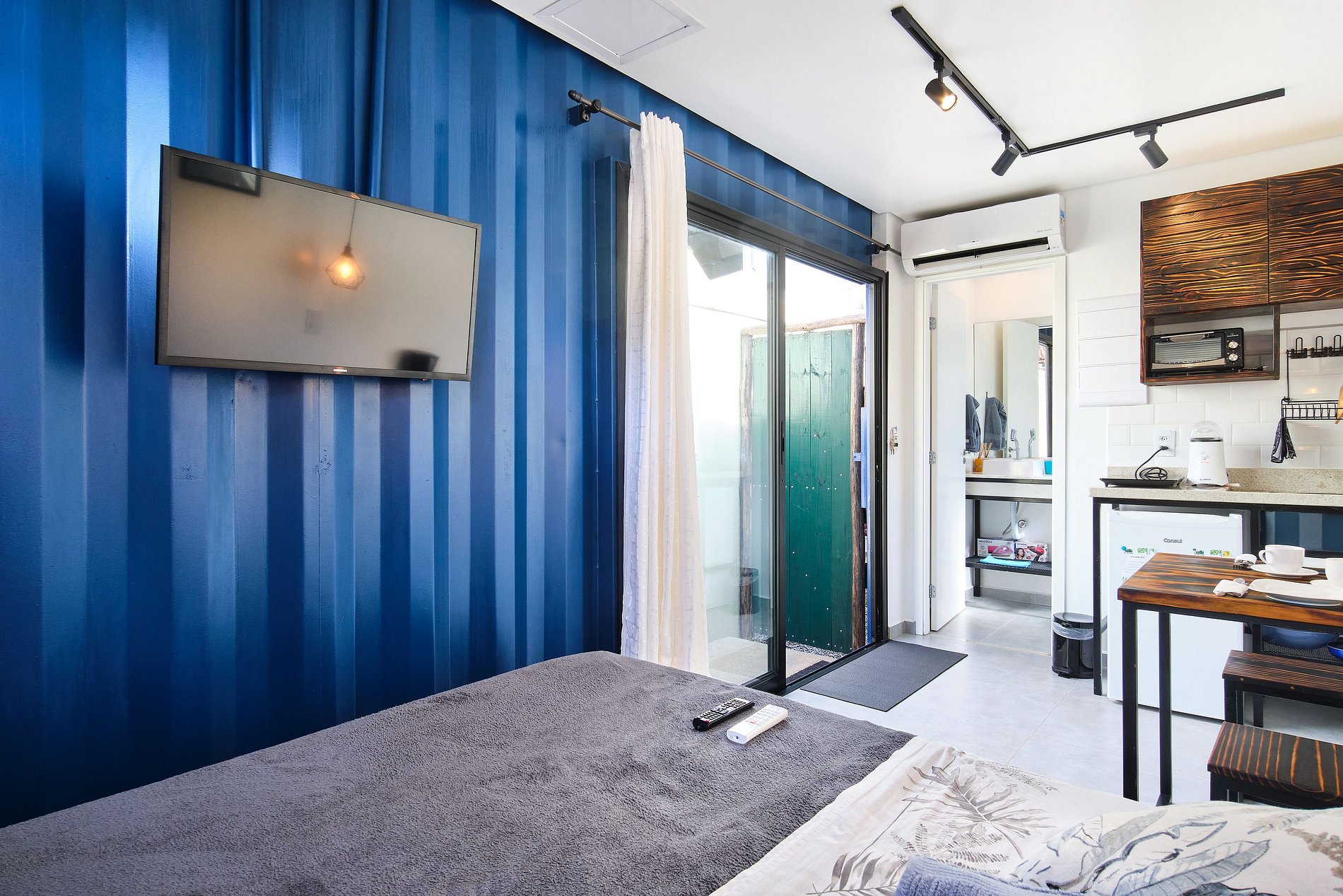 A Suíte Tiny House possue cama de casal com ar-condicionado, uma ótima cozinha equipada com frigobar e todos utensílios necessários para cozinhar confortavelmente sem precisar sair de casa, além de um charmoso banheiro privativo.